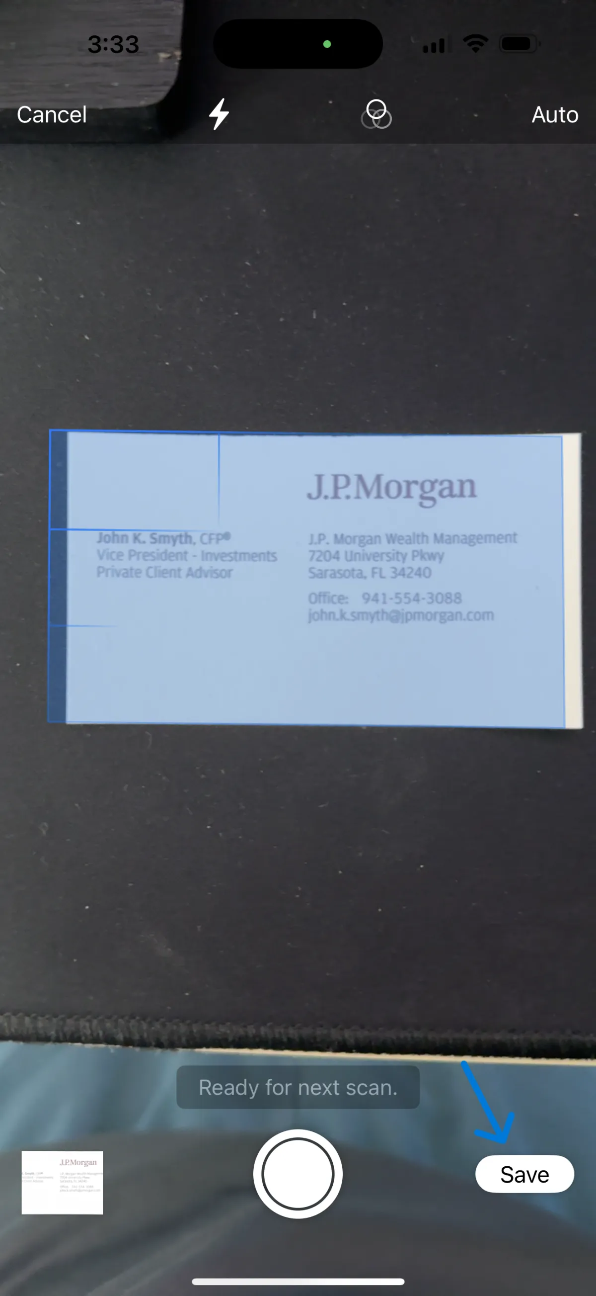 Step 1. Tap the Contacts tab and then the + sign followed by Scan Business Card.